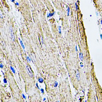 Immunohistochemical analysis of Filamin B staining in rat heart formalin fixed paraffin embedded tissue section. The section was pre-treated using heat mediated antigen retrieval with sodium citrate buffer (pH 6.0). The section was then incubated with the antibody at room temperature and detected using an HRP conjugated compact polymer system. DAB was used as the chromogen. The section was then counterstained with haematoxylin and mounted with DPX. -