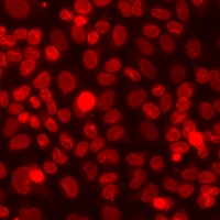 Immunofluorescent analysis of SETD2 staining in A549 cells. Formalin-fixed cells were permeabilized with 0.1% Triton X-100 in TBS for 5-10 minutes and blocked with 3% BSA-PBS for 30 minutes at room temperature. Cells were probed with the primary antibody in 3% BSA-PBS and incubated overnight at 4 °C in a humidified chamber. Cells were washed with PBST and incubated with a DyLight 594-conjugated secondary antibody (red) in PBS at room temperature in the dark.