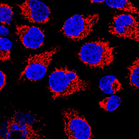 Immunofluorescent analysis of LRP130 staining in HeLa cells. Formalin-fixed cells were permeabilized with 0.1% Triton X-100 in TBS for 5-10 minutes and blocked with 3% BSA-PBS for 30 minutes at room temperature. Cells were probed with the primary antibody in 3% BSA-PBS and incubated overnight at 4 °C in a humidified chamber. Cells were washed with PBST and incubated with a AF594-conjugated secondary antibody (red) in PBS at room temperature in the dark. DAPI was used to stain the cell nuclei (blue).