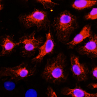 Immunofluorescent analysis of ACTN2 staining in HeLa cells. Formalin-fixed cells were permeabilized with 0.1% Triton X-100 in TBS for 5-10 minutes and blocked with 3% BSA-PBS for 30 minutes at room temperature. Cells were probed with the primary antibody in 3% BSA-PBS and incubated overnight at 4 °C in a humidified chamber. Cells were washed with PBST and incubated with a AF594-conjugated secondary antibody (red) in PBS at room temperature in the dark. DAPI was used to stain the cell nuclei (blue).