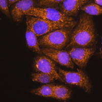 Immunofluorescent analysis of ATP6V1E1 staining in HeLa cells. Formalin-fixed cells were permeabilized with 0.1% Triton X-100 in TBS for 5-10 minutes and blocked with 3% BSA-PBS for 30 minutes at room temperature. Cells were probed with the primary antibody in 3% BSA-PBS and incubated overnight at 4 °C in a humidified chamber. Cells were washed with PBST and incubated with a AF594-conjugated secondary antibody (red) in PBS at room temperature in the dark. DAPI was used to stain the cell nuclei (blue).