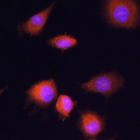 Immunofluorescent analysis of PGAM1 staining in L929 cells. Formalin-fixed cells were permeabilized with 0.1% Triton X-100 in TBS for 5-10 minutes and blocked with 3% BSA-PBS for 30 minutes at room temperature. Cells were probed with the primary antibody in 3% BSA-PBS and incubated overnight at 4 °C in a humidified chamber. Cells were washed with PBST and incubated with a AF594-conjugated secondary antibody (red) in PBS at room temperature in the dark. DAPI was used to stain the cell nuclei (blue).