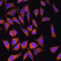Immunofluorescent analysis of PMM2 staining in L929 cells. Formalin-fixed cells were permeabilized with 0.1% Triton X-100 in TBS for 5-10 minutes and blocked with 3% BSA-PBS for 30 minutes at room temperature. Cells were probed with the primary antibody in 3% BSA-PBS and incubated overnight at 4 °C in a humidified chamber. Cells were washed with PBST and incubated with a AF594-conjugated secondary antibody (red) in PBS at room temperature in the dark. DAPI was used to stain the cell nuclei (blue).