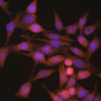 Immunofluorescent analysis of PSMB6 staining in HeLa cells. Formalin-fixed cells were permeabilized with 0.1% Triton X-100 in TBS for 5-10 minutes and blocked with 3% BSA-PBS for 30 minutes at room temperature. Cells were probed with the primary antibody in 3% BSA-PBS and incubated overnight at 4 °C in a humidified chamber. Cells were washed with PBST and incubated with a AF594-conjugated secondary antibody (red) in PBS at room temperature in the dark. DAPI was used to stain the cell nuclei (blue).