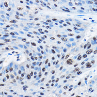 Immunohistochemical analysis of NUDT21 staining in human esophageal cancer formalin fixed paraffin embedded tissue section. The section was pre-treated using heat mediated antigen retrieval with sodium citrate buffer (pH 6.0). The section was then incubated with the antibody at room temperature and detected using an HRP conjugated compact polymer system. DAB was used as the chromogen. The section was then counterstained with haematoxylin and mounted with DPX.