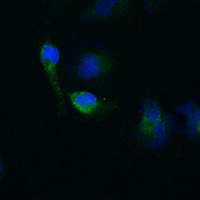 Immunofluorescent analysis of BACE1 staining in U251MG cells. Formalin-fixed cells were permeabilized with 0.1% Triton X-100 in TBS for 5-10 minutes and blocked with 3% BSA-PBS for 30 minutes at room temperature. Cells were probed with the primary antibody in 3% BSA-PBS and incubated overnight at 4 °C in a humidified chamber. Cells were washed with PBST and incubated with a AF488-conjugated secondary antibody (green) in PBS at room temperature in the dark.