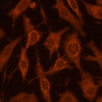 Immunofluorescent analysis of UCP1 staining in L929 cells. Formalin-fixed cells were permeabilized with 0.1% Triton X-100 in TBS for 5-10 minutes and blocked with 3% BSA-PBS for 30 minutes at room temperature. Cells were probed with the primary antibody in 3% BSA-PBS and incubated overnight at 4 °C in a humidified chamber. Cells were washed with PBST and incubated with a DyLight 594-conjugated secondary antibody (red) in PBS at room temperature in the dark.