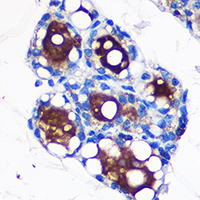 Immunohistochemical analysis of UCP1 staining in rat fat formalin fixed paraffin embedded tissue section. The section was pre-treated using heat mediated antigen retrieval with sodium citrate buffer (pH 6.0). The section was then incubated with the antibody at room temperature and detected using an HRP conjugated compact polymer system. DAB was used as the chromogen. The section was then counterstained with haematoxylin and mounted with DPX. -