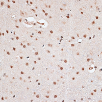 Immunohistochemical analysis of RBM3 staining in rat brain formalin fixed paraffin embedded tissue section. The section was pre-treated using heat mediated antigen retrieval with sodium citrate buffer (pH 6.0). The section was then incubated with the antibody at room temperature and detected using an HRP conjugated compact polymer system. DAB was used as the chromogen. The section was then counterstained with haematoxylin and mounted with DPX.