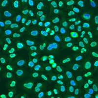 Immunofluorescent analysis of hnRNP I staining in U2OS cells. Formalin-fixed cells were permeabilized with 0.1% Triton X-100 in TBS for 5-10 minutes and blocked with 3% BSA-PBS for 30 minutes at room temperature. Cells were probed with the primary antibody in 3% BSA-PBS and incubated overnight at 4 °C in a humidified chamber. Cells were washed with PBST and incubated with a AF488-conjugated secondary antibody (green) in PBS at room temperature in the dark. DAPI was used to stain the cell nuclei (blue).