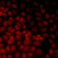 Immunofluorescent analysis of EAF2 staining in A549 cells. Formalin-fixed cells were permeabilized with 0.1% Triton X-100 in TBS for 5-10 minutes and blocked with 3% BSA-PBS for 30 minutes at room temperature. Cells were probed with the primary antibody in 3% BSA-PBS and incubated overnight at 4 °C in a humidified chamber. Cells were washed with PBST and incubated with a DyLight 594-conjugated secondary antibody (red) in PBS at room temperature in the dark.