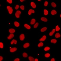 Immunofluorescent analysis of IWS1 staining in A549 cells. Formalin-fixed cells were permeabilized with 0.1% Triton X-100 in TBS for 5-10 minutes and blocked with 3% BSA-PBS for 30 minutes at room temperature. Cells were probed with the primary antibody in 3% BSA-PBS and incubated overnight at 4 °C in a humidified chamber. Cells were washed with PBST and incubated with a DyLight 594-conjugated secondary antibody (red) in PBS at room temperature in the dark.