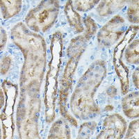 Immunohistochemical analysis of C9orf72 staining in rat kidney formalin fixed paraffin embedded tissue section. The section was pre-treated using heat mediated antigen retrieval with sodium citrate buffer (pH 6.0). The section was then incubated with the antibody at room temperature and detected using an HRP conjugated compact polymer system. DAB was used as the chromogen. The section was then counterstained with haematoxylin and mounted with DPX.