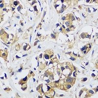 Immunohistochemical analysis of CAML staining in human breast cancer formalin fixed paraffin embedded tissue section. The section was pre-treated using heat mediated antigen retrieval with sodium citrate buffer (pH 6.0). The section was then incubated with the antibody at room temperature and detected using an HRP conjugated compact polymer system. DAB was used as the chromogen. The section was then counterstained with haematoxylin and mounted with DPX. -