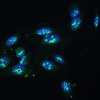 Immunofluorescent analysis of CCDC59 staining in U2OS cells. Formalin-fixed cells were permeabilized with 0.1% Triton X-100 in TBS for 5-10 minutes and blocked with 3% BSA-PBS for 30 minutes at room temperature. Cells were probed with the primary antibody in 3% BSA-PBS and incubated overnight at 4 °C in a hidified chamber. Cells were washed with PBST and incubated with a Alexa Fluor 488-conjugated secondary antibody (green) in PBS at room temperature in the dark.