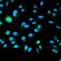 Immunofluorescent analysis of p16 INK4a staining in A549 cells. Formalin-fixed cells were permeabilized with 0.1% Triton X-100 in TBS for 5-10 minutes and blocked with 3% BSA-PBS for 30 minutes at room temperature. Cells were probed with the primary antibody in 3% BSA-PBS and incubated overnight at 4 °C in a hidified chamber. Cells were washed with PBST and incubated with a Alexa Fluor 488-conjugated secondary antibody (green) in PBS at room temperature in the dark.