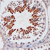 Immunohistochemical analysis of p16 INK4a staining in mouse testis formalin fixed paraffin embedded tissue section. The section was pre-treated using heat mediated antigen retrieval with sodium citrate buffer (pH 6.0). The section was then incubated with the antibody at room temperature and detected using an HRP conjugated compact polymer system. DAB was used as the chromogen. The section was then counterstained with haematoxylin and mounted with DPX. -