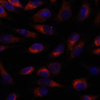 Immunofluorescent analysis of CHP1 staining in L929 cells. Formalin-fixed cells were permeabilized with 0.1% Triton X-100 in TBS for 5-10 minutes and blocked with 3% BSA-PBS for 30 minutes at room temperature. Cells were probed with the primary antibody in 3% BSA-PBS and incubated overnight at 4 °C in a humidified chamber. Cells were washed with PBST and incubated with a AF594-conjugated secondary antibody (red) in PBS at room temperature in the dark. DAPI was used to stain the cell nuclei (blue).
