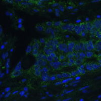 Immunofluorescent analysis of CLCA1 staining in human colon cells. Formalin-fixed cells were permeabilized with 0.1% Triton X-100 in TBS for 5-10 minutes and blocked with 3% BSA-PBS for 30 minutes at room temperature. Cells were probed with the primary antibody in 3% BSA-PBS and incubated overnight at 4 °C in a hidified chamber. Cells were washed with PBST and incubated with a Alexa Fluor 488-conjugated secondary antibody (green) in PBS at room temperature in the dark.