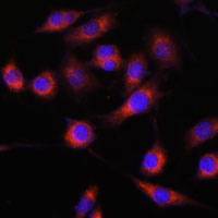 Immunofluorescent analysis of GPBP staining in L929 cells. Formalin-fixed cells were permeabilized with 0.1% Triton X-100 in TBS for 5-10 minutes and blocked with 3% BSA-PBS for 30 minutes at room temperature. Cells were probed with the primary antibody in 3% BSA-PBS and incubated overnight at 4 °C in a humidified chamber. Cells were washed with PBST and incubated with a AF594-conjugated secondary antibody (red) in PBS at room temperature in the dark. DAPI was used to stain the cell nuclei (blue).