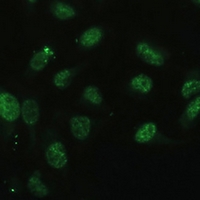 Immunofluorescent analysis of DDX50 staining in U2OS cells. Formalin-fixed cells were permeabilized with 0.1% Triton X-100 in TBS for 5-10 minutes and blocked with 3% BSA-PBS for 30 minutes at room temperature. Cells were probed with the primary antibody in 3% BSA-PBS and incubated overnight at 4 °C in a hidified chamber. Cells were washed with PBST and incubated with a Alexa Fluor 488-conjugated secondary antibody (green) in PBS at room temperature in the dark.