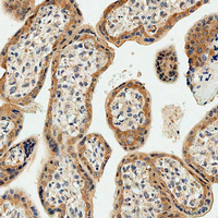 Immunohistochemical analysis of DKK1 staining in human placenta tissue formalin fixed paraffin embedded tissue section. The section was pre-treated using heat mediated antigen retrieval with sodium citrate buffer (pH 6.0). The section was then incubated with the antibody at room temperature and detected using an HRP conjugated compact polymer system. DAB was used as the chromogen. The section was then counterstained with haematoxylin and mounted with DPX. -