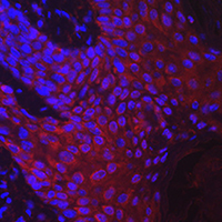 Immunofluorescent analysis of DKK2 staining in human skin cancer. Formalin-fixed cells were permeabilized with 0.1% Triton X-100 in TBS for 5-10 minutes and blocked with 3% BSA-PBS for 30 minutes at room temperature. Cells were probed with the primary antibody in 3% BSA-PBS and incubated overnight at 4 °C in a humidified chamber. Cells were washed with PBST and incubated with a AF594-conjugated secondary antibody (red) in PBS at room temperature in the dark. DAPI was used to stain the cell nuclei (blue).