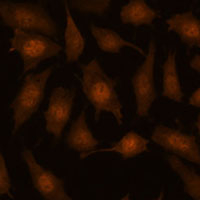 Immunofluorescent analysis of EEF1E1 staining in L929 cells. Formalin-fixed cells were permeabilized with 0.1% Triton X-100 in TBS for 5-10 minutes and blocked with 3% BSA-PBS for 30 minutes at room temperature. Cells were probed with the primary antibody in 3% BSA-PBS and incubated overnight at 4 °C in a humidified chamber. Cells were washed with PBST and incubated with a AF594-conjugated secondary antibody (red) in PBS at room temperature in the dark. DAPI was used to stain the cell nuclei (blue).