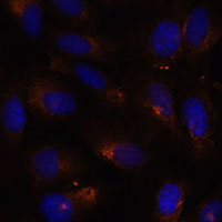 Immunofluorescent analysis of ESYT1 staining in U2OS cells. Formalin-fixed cells were permeabilized with 0.1% Triton X-100 in TBS for 5-10 minutes and blocked with 3% BSA-PBS for 30 minutes at room temperature. Cells were probed with the primary antibody in 3% BSA-PBS and incubated overnight at 4 °C in a humidified chamber. Cells were washed with PBST and incubated with a AF594-conjugated secondary antibody (red) in PBS at room temperature in the dark. DAPI was used to stain the cell nuclei (blue).