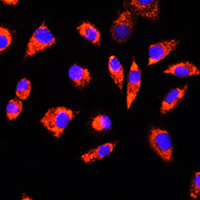 Immunofluorescent analysis of GCSH staining in L929 cells. Formalin-fixed cells were permeabilized with 0.1% Triton X-100 in TBS for 5-10 minutes and blocked with 3% BSA-PBS for 30 minutes at room temperature. Cells were probed with the primary antibody in 3% BSA-PBS and incubated overnight at 4 °C in a humidified chamber. Cells were washed with PBST and incubated with a AF594-conjugated secondary antibody (red) in PBS at room temperature in the dark. DAPI was used to stain the cell nuclei (blue).