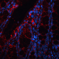 Immunofluorescent analysis of A33 staining in mouse colon tissues. Formalin-fixed cells were permeabilized with 0.1% Triton X-100 in TBS for 5-10 minutes and blocked with 3% BSA-PBS for 30 minutes at room temperature. Cells were probed with the primary antibody in 3% BSA-PBS and incubated overnight at 4 °C in a hidified chamber. Cells were washed with PBST and incubated with a Alexa Fluor 594-conjugated secondary antibody (red) in PBS at room temperature in the dark.