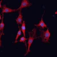 Immunofluorescent analysis of GSTM3 staining in C6 cells. Formalin-fixed cells were permeabilized with 0.1% Triton X-100 in TBS for 5-10 minutes and blocked with 3% BSA-PBS for 30 minutes at room temperature. Cells were probed with the primary antibody in 3% BSA-PBS and incubated overnight at 4 °C in a hidified chamber. Cells were washed with PBST and incubated with a Alexa Fluor 594-conjugated secondary antibody (red) in PBS at room temperature in the dark.