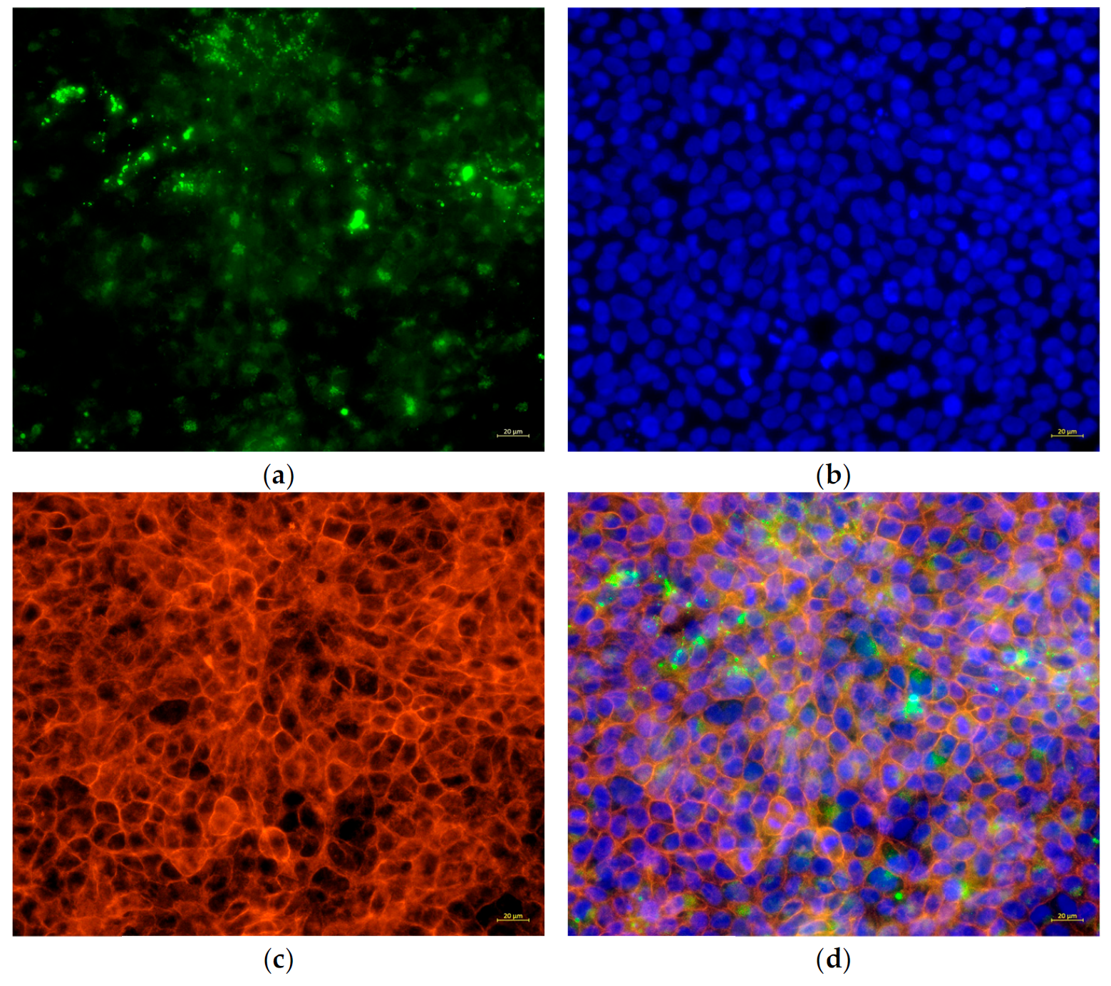 Actin filaments (red) were stained with Phalloidin - AcalephFluor594
