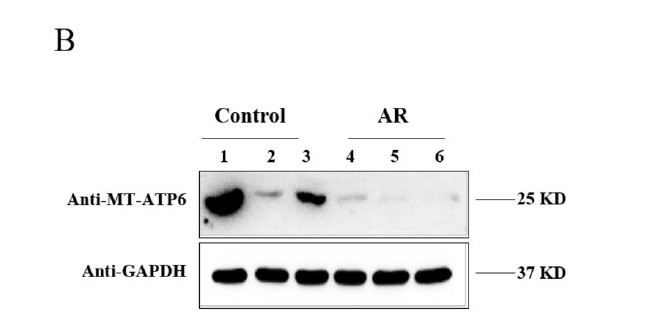 产品描述:Rabbit polyclonal antibody to ATP6免疫原:KLH-conjugated synthetic peptide encompassing a sequence within the center region of human ATP6. The exact sequence is proprietary.纯化方式:The antibody was purified by immunogen affinity chromatography.克隆类型:Polyclonal产品形式:Liquid in 0.42% Potassium phosphate, 0.87% Sodium chloride, pH 7.3, 30% glycerol, and 0.01% sodium azide.稀释比:WB (1/500 - 1/1000), IF/IC (1/50 - 1/200)基因名称:MT-ATP6相关名称:ATP6; ATPASE6; MTATP6; ATP synthase subunit a; F-ATPase protein 6