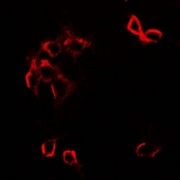 Immunofluorescent analysis of GFRA1 staining in SW480 cells. Formalin-fixed cells were permeabilized with 0.1% Triton X-100 in TBS for 5-10 minutes and blocked with 3% BSA-PBS for 30 minutes at room temperature. Cells were probed with the primary antibody in 3% BSA-PBS and incubated overnight at 4 °C in a humidified chamber. Cells were washed with PBST and incubated with a DyLight 594-conjugated secondary antibody (red) in PBS at room temperature in the dark.