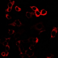 Immunofluorescent analysis of GLUR3 staining in U2OS cells. Formalin-fixed cells were permeabilized with 0.1% Triton X-100 in TBS for 5-10 minutes and blocked with 3% BSA-PBS for 30 minutes at room temperature. Cells were probed with the primary antibody in 3% BSA-PBS and incubated overnight at 4 °C in a humidified chamber. Cells were washed with PBST and incubated with a DyLight 594-conjugated secondary antibody (red) in PBS at room temperature in the dark.