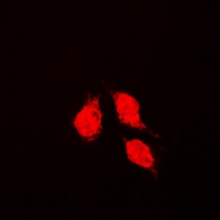 Immunofluorescent analysis of Glutathione Synthetase staining in K562 cells. Formalin-fixed cells were permeabilized with 0.1% Triton X-100 in TBS for 5-10 minutes and blocked with 3% BSA-PBS for 30 minutes at room temperature. Cells were probed with the primary antibody in 3% BSA-PBS and incubated overnight at 4 °C in a humidified chamber. Cells were washed with PBST and incubated with a DyLight 594-conjugated secondary antibody (red) in PBS at room temperature in the dark.